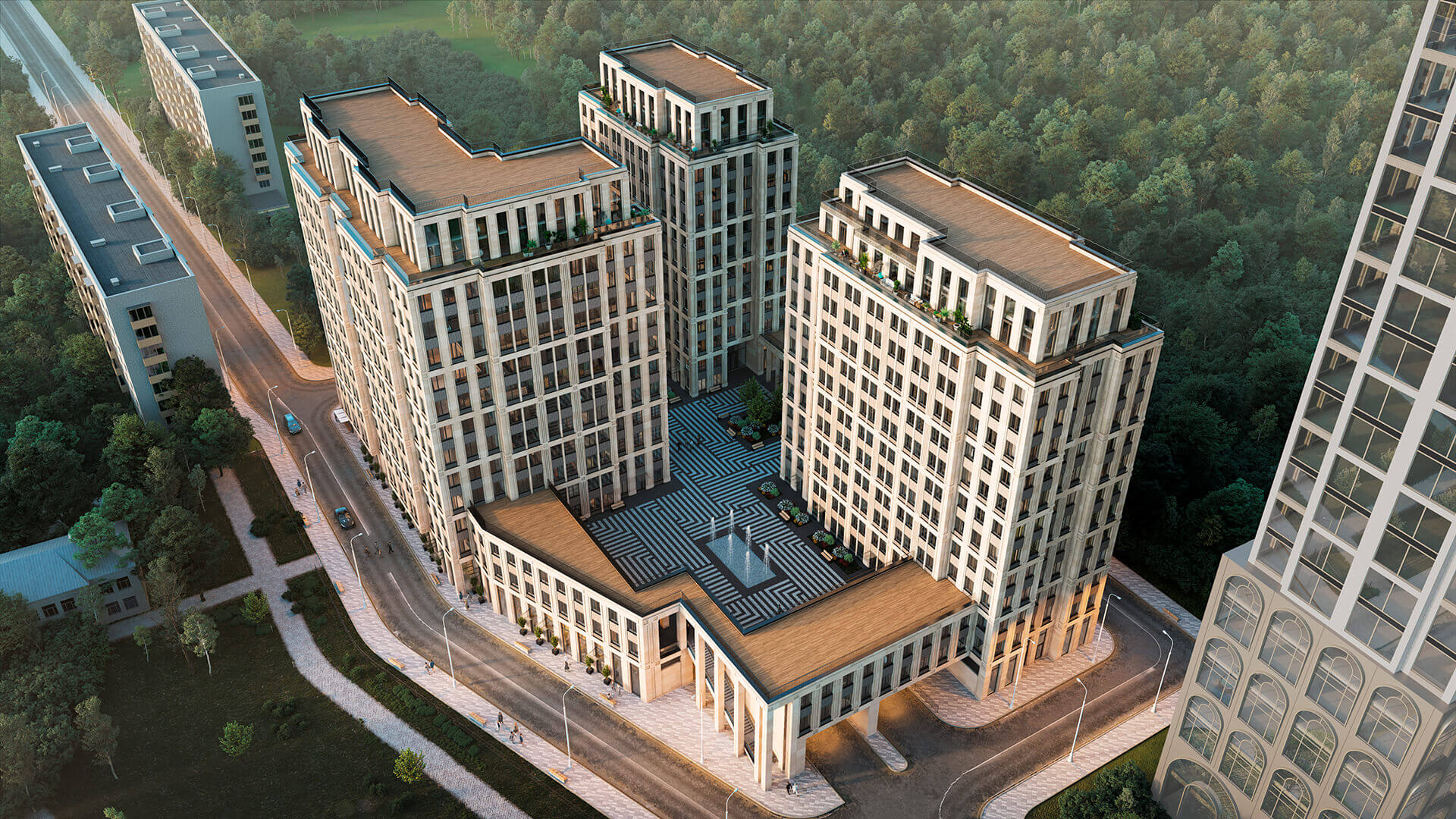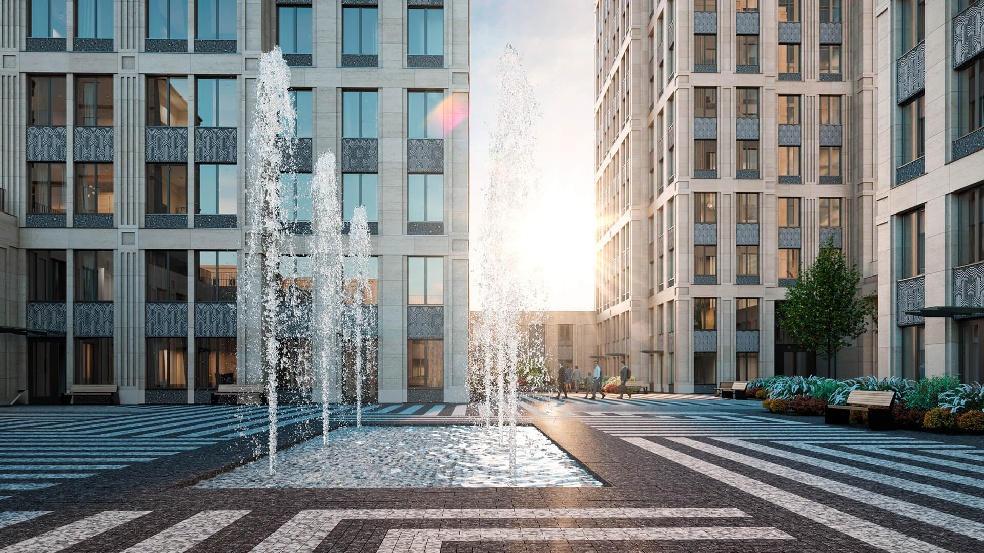 Территория ЖК «Поклонная 7» спроектирована как закрытое приватное пространство, доступное только для резидентов. Внутренний двор включает озелененные зоны для прогулок, элегантный фонтан и уютные лаунж-зоны для отдыха.