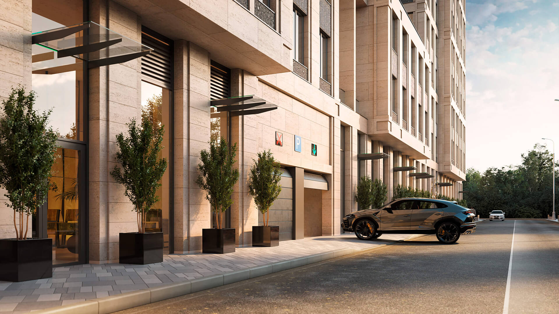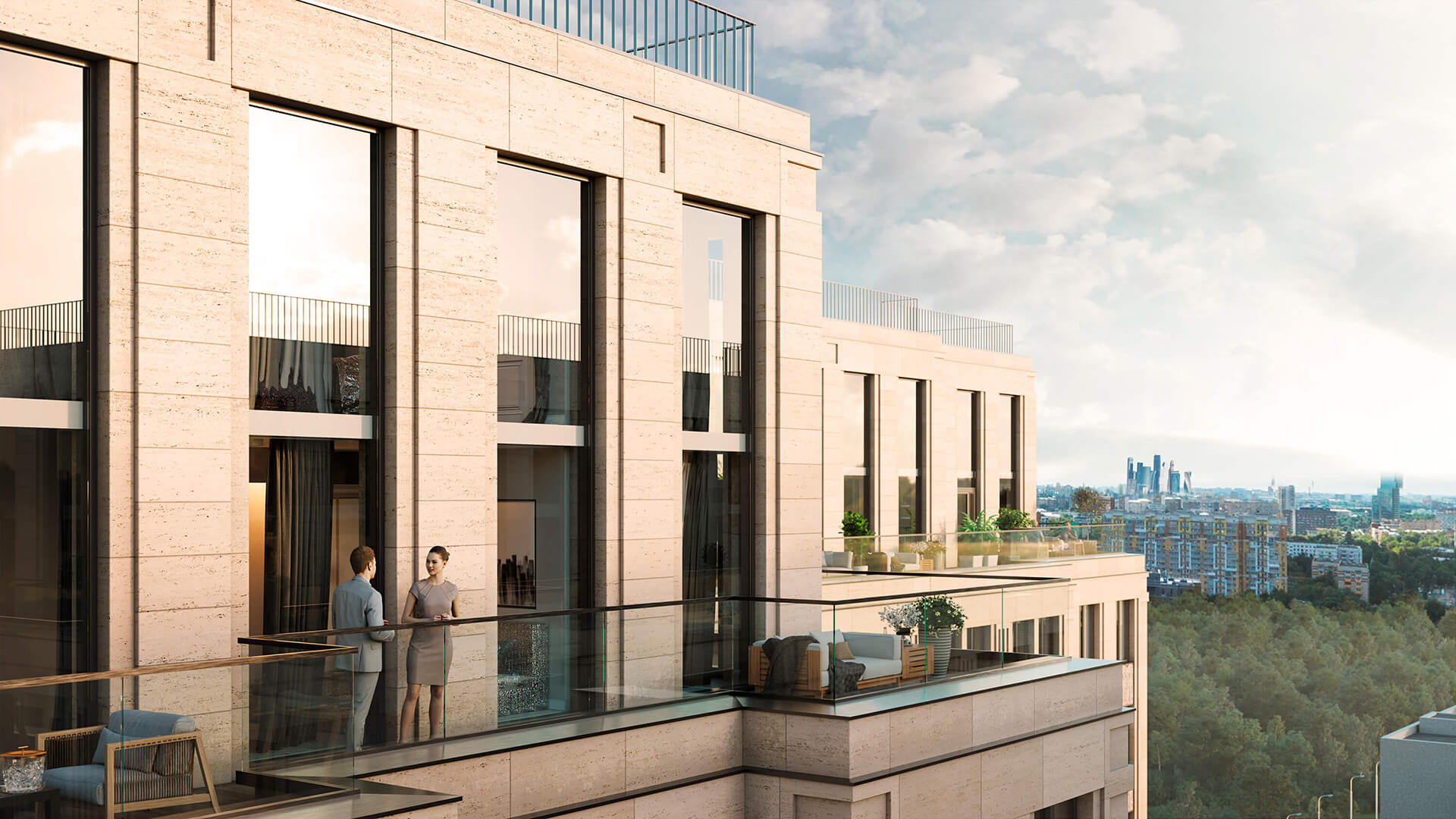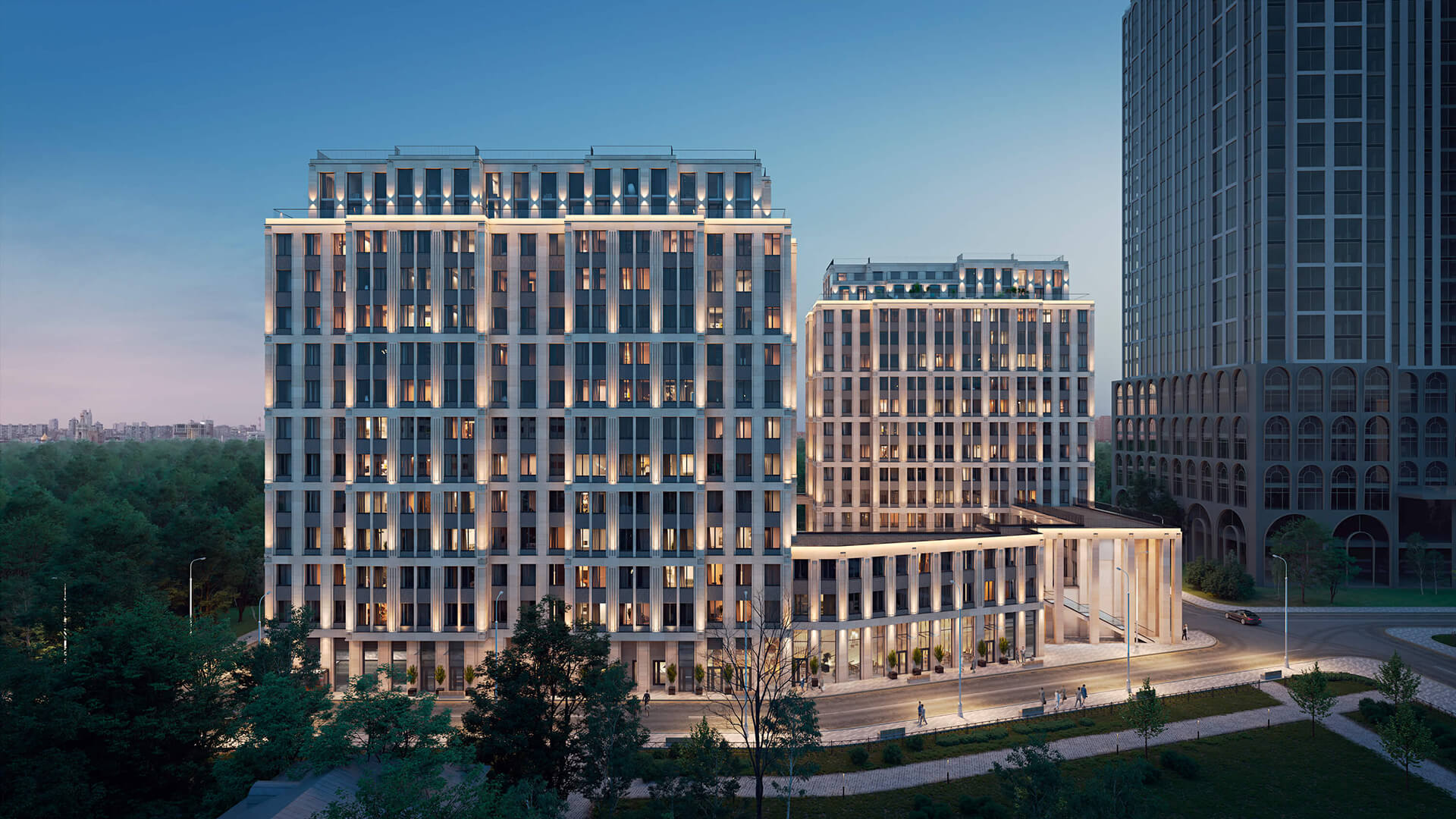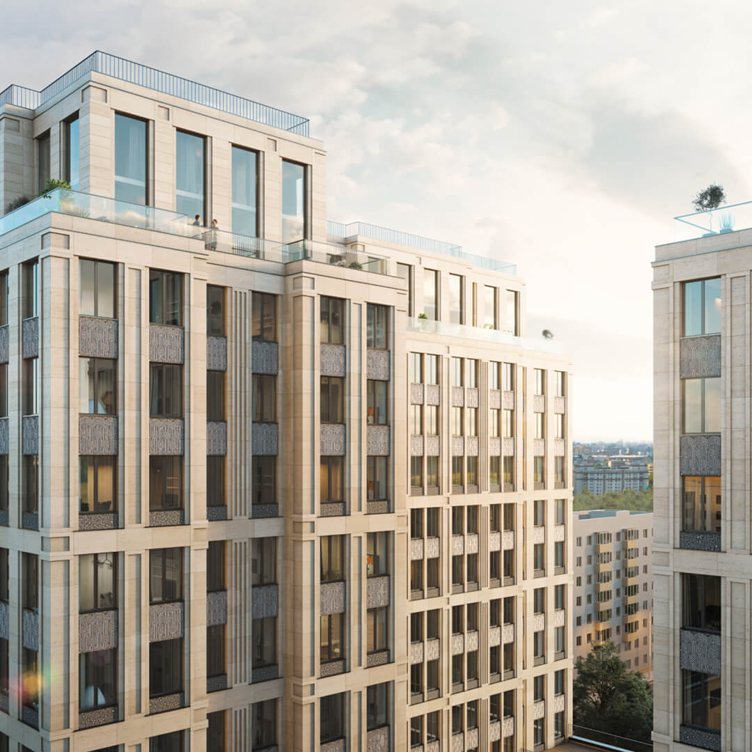 Архитектура жилого комплекса «Поклонная 7» — это гармоничное сочетание современного минимализма и классической элегантности. Фасады зданий облицованы натуральным камнем, что придает комплексу монументальность и подчеркивает его статусный характер.