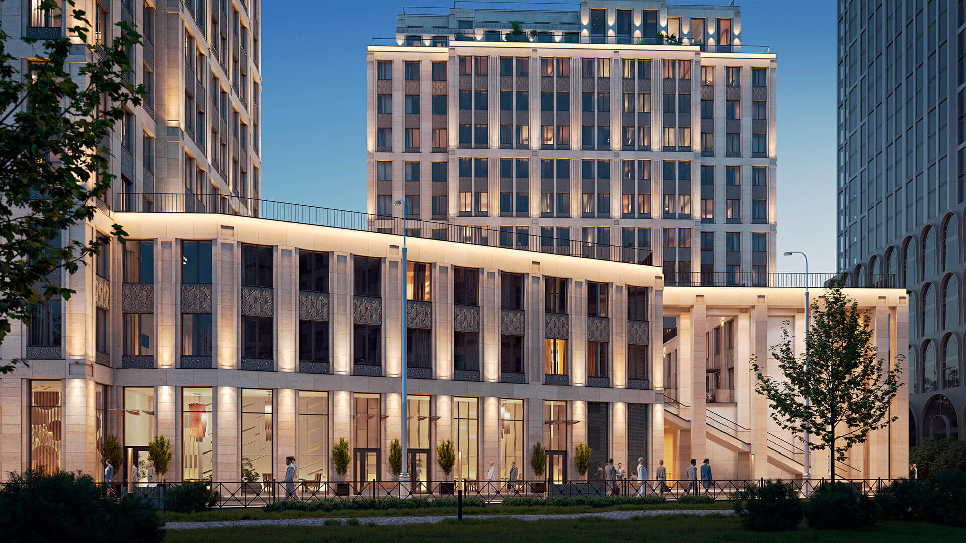 Проект включает три корпуса переменной этажности, объединенных стилобатной частью. Особое внимание уделено ночной подсветке, которая создает эффектное освещение и выделяет комплекс в вечернее время.