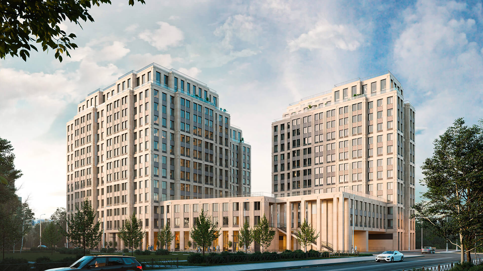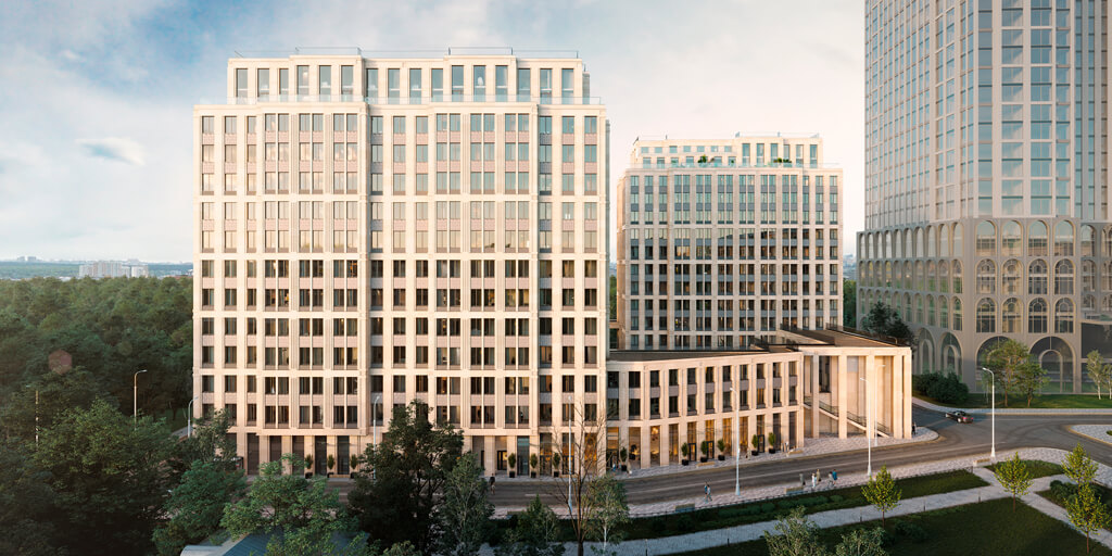Архитектура жилого комплекса «Поклонная 7» — это гармоничное сочетание современного минимализма и классической элегантности. Фасады зданий облицованы натуральным камнем, что придает комплексу монументальность и подчеркивает его статусный характер.