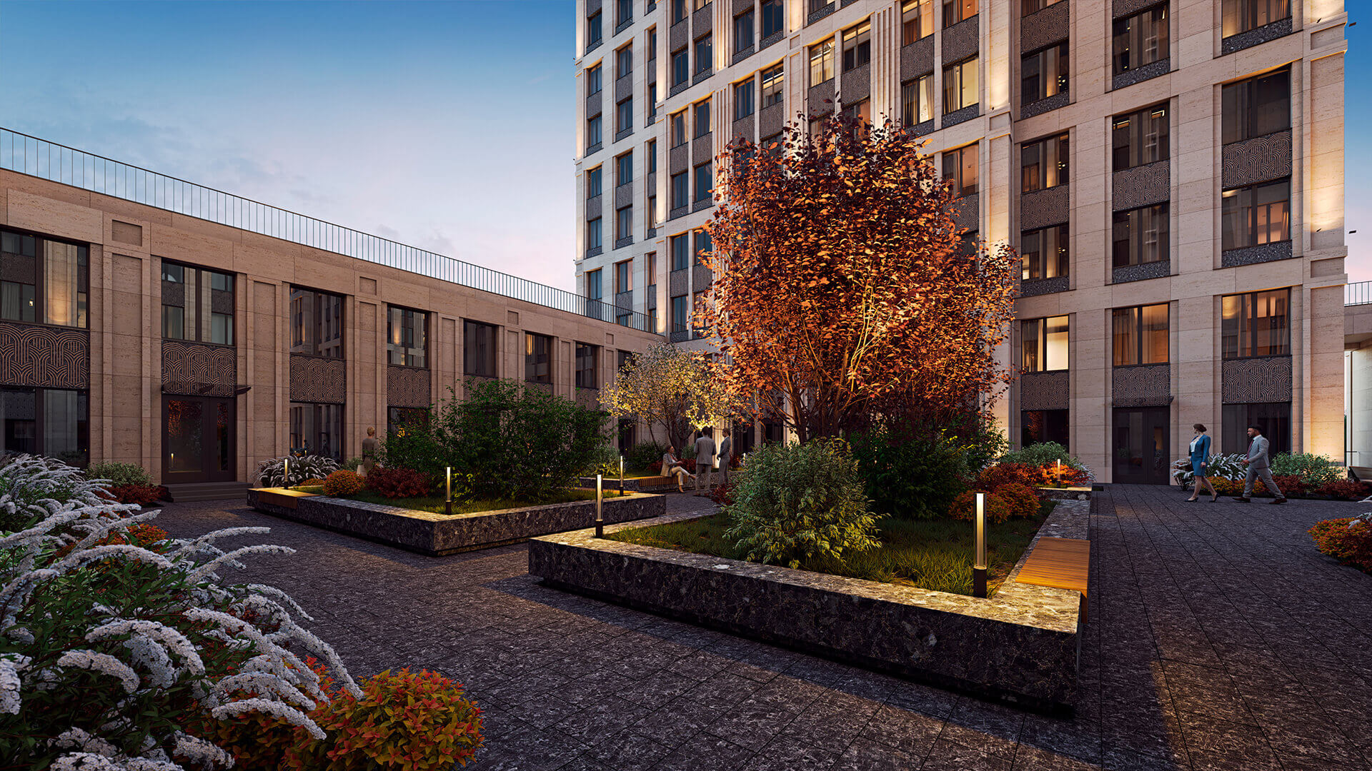 Территория ЖК «Поклонная 7» спроектирована как закрытое приватное пространство, доступное только для резидентов. Внутренний двор включает озелененные зоны для прогулок, элегантный фонтан и уютные лаунж-зоны для отдыха.